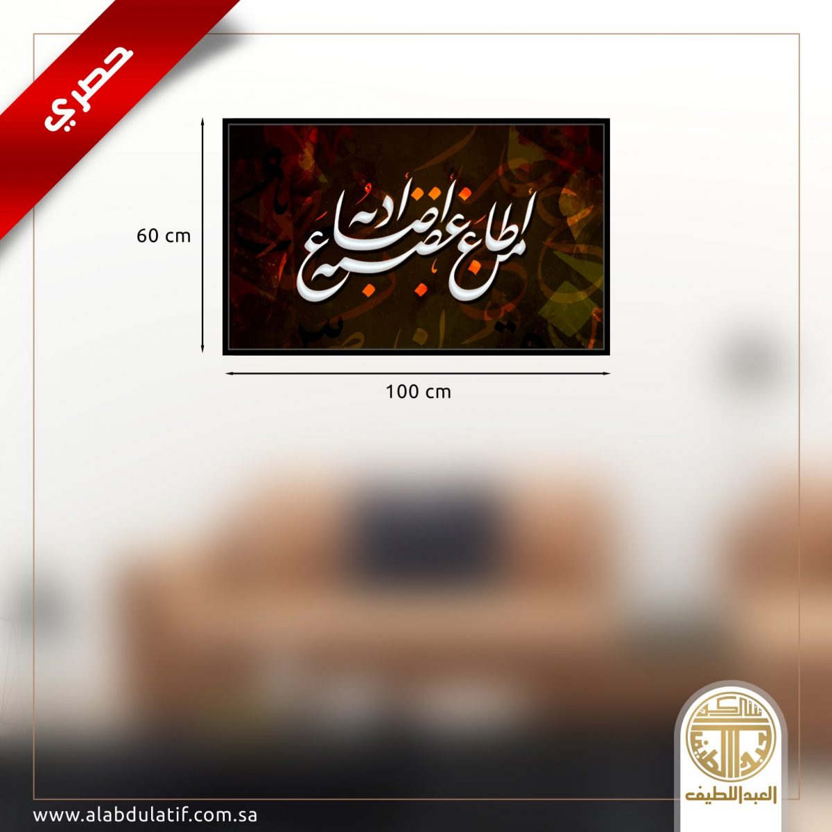لوحة فنية بالخط العربي للحكمة ( من أطاع غضبه أضاع أدبه ) بتصميم خاص احترافي ، وطباعة عالية الدقة ، وتنفيذ متقن .عدد القطع : قطعة واحدةالمقاسات : 60×100 سمخامة الطباعة : كانفاس مثبت على إطار خشبيإطار خارجي أسود.