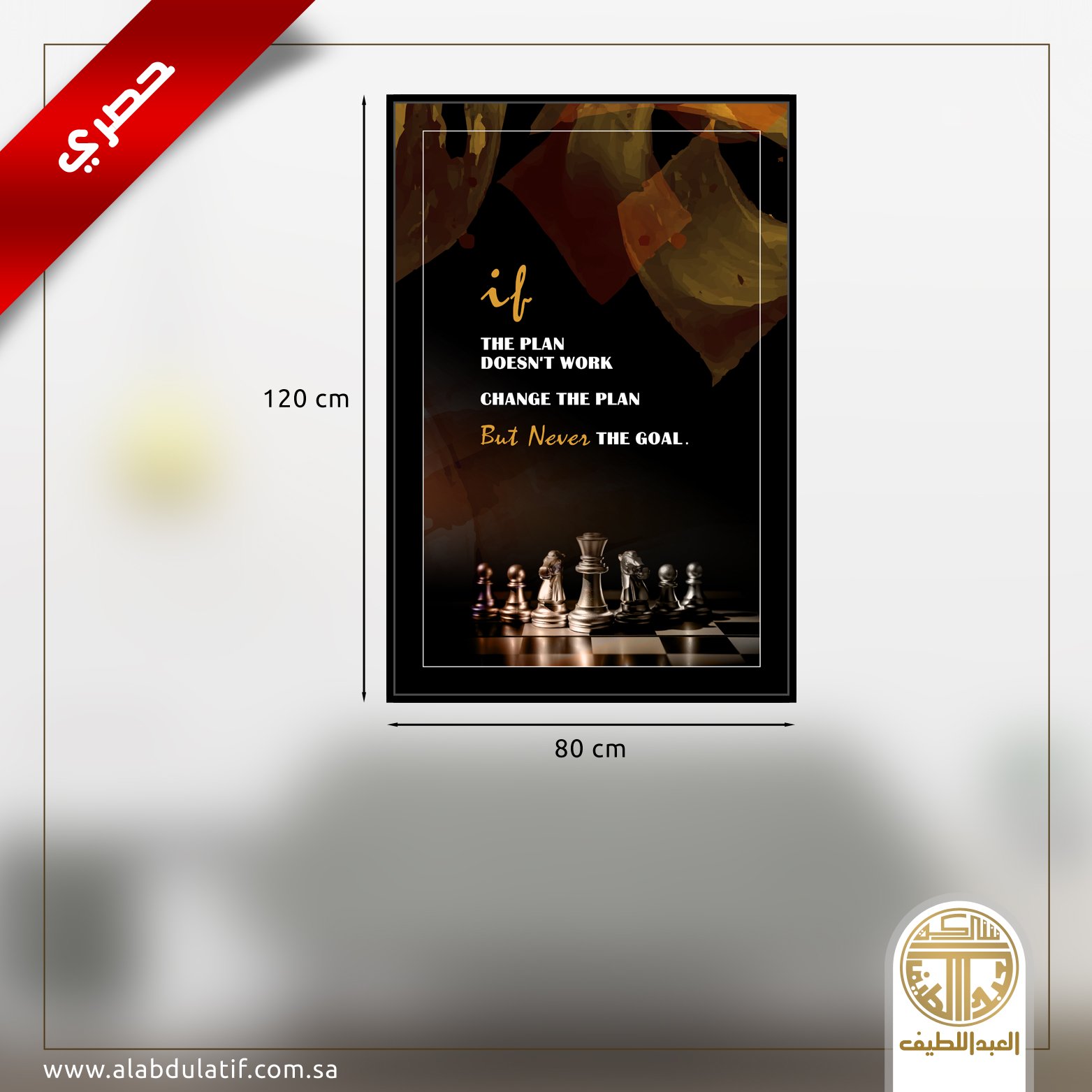 لوحة فنية للمثل الإنجليزي ( إذا لم تعمل الخطة .. غير الخطة ولاتغير الهدف ) بتصميم خاص احترافي ، وطباعة عالية الدقة ، وتنفيذ متقن .عدد القطع : قطعة واحدةالمقاسات : 80×120 سمخامة الطباعة : كانفاس مثبت على إطار خشبيإطار خارجي أسود.